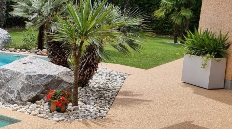L’aspect décoratif est l’un de ses plus grands atouts. Les granulats existent en de nombreuses couleurs : tons naturels, marbrés, mélanges audacieux… Vous pouvez jouer sur les contrastes, créer des bordures ou des motifs personnalisés. Certains projets vont jusqu’à intégrer des logos ou des formes géométriques. C’est un matériau qui laisse place à la créativité, tout en restant sobre et élégant.