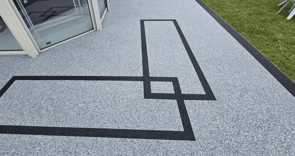 - Usage piéton : 5 % de résine sur le poids de granulats. Convient aux terrasses, plages de piscine, cheminements.